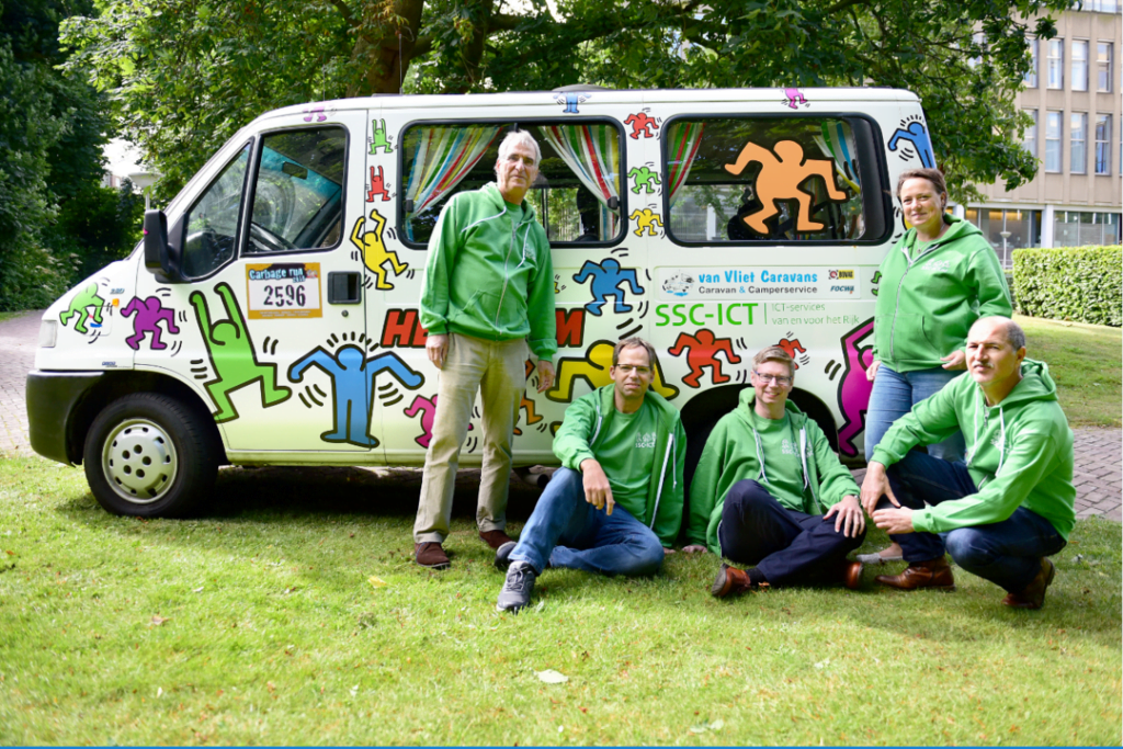 Toen we de bus kochten zag hij er nogal saai uit en zaten er stickers op van de Roparun waar de bus als ondersteuning had meegereden. Met zo’n saaie bus, kan je niet meedoen met de Carbagerun, dus was het tijd om hem op te vrolijken. We haalden onze inspiratie uit de vrolijke figuurtjes van Keith Haring en met behulp van onze sponsor, waren we in staat om de bus vrolijk te laten bedrukken en om als team te presenteren.